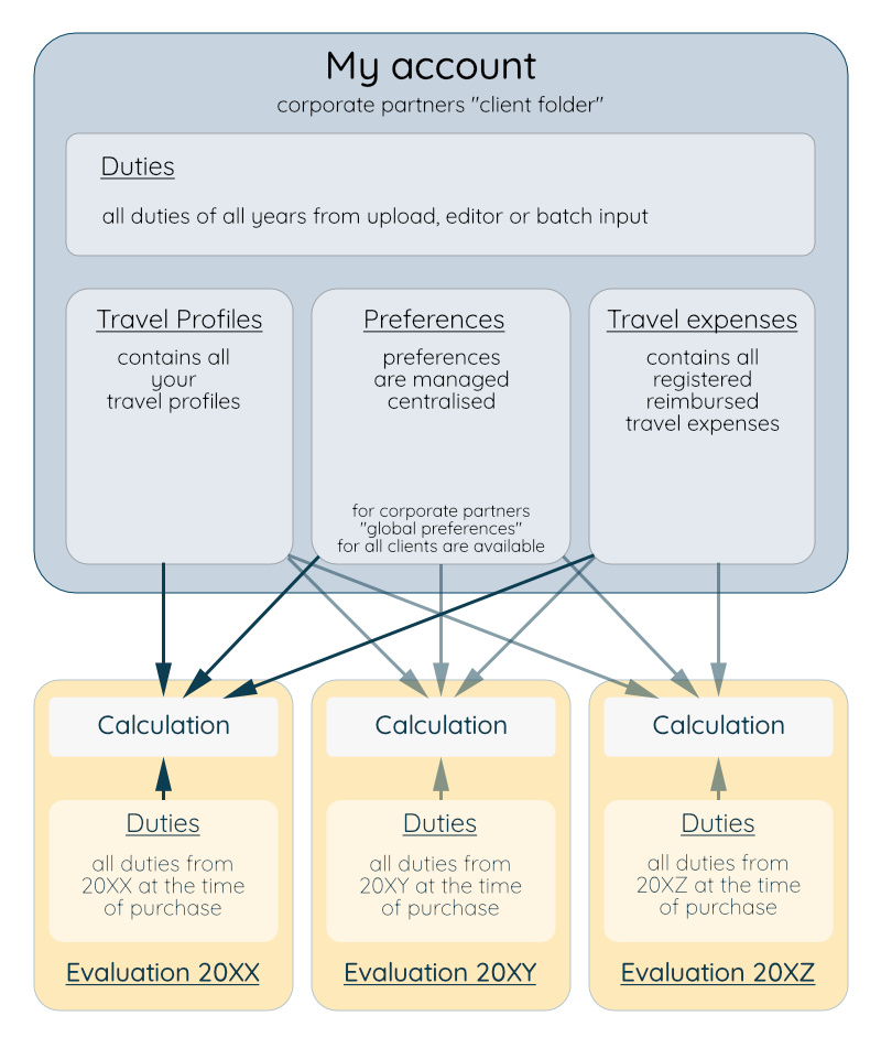 The calculation of your evaluation happens on-the-fly using the duty and journey events in your evaluation and the preferences and travel Profiles. If you want to compare different preferences, you may build export versions (pdf/xml) to fixate the results at any given time.A few insights...